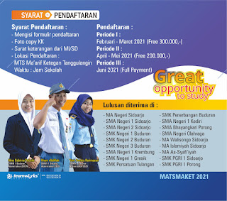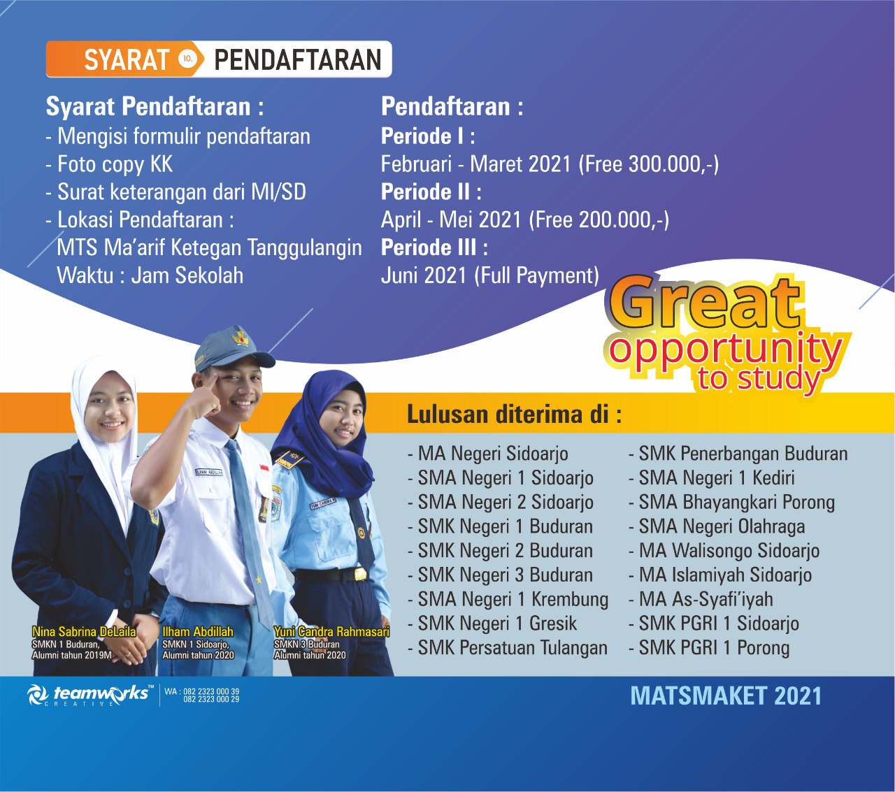Pendaftaran peserta didik baru MTs Ma'arif Ketegan telah dibuka, bagi anda yang ada di candi tulangan porong krembung tanggulangin atau sekitarnya bisa mempercayakan putra putri anda kepada kami. Memilih jenjang pendidikan sekolah menengah pertama (SMP) unggulan terbaik dan modern, MATSMAKET adalah pilihan yang tepat untuk putra putri anda. Dengan fasilitas yang lengkap peserta didik semakin mudah dalam mengembangkan kemampuannya. Lengkapi persyaratannya.